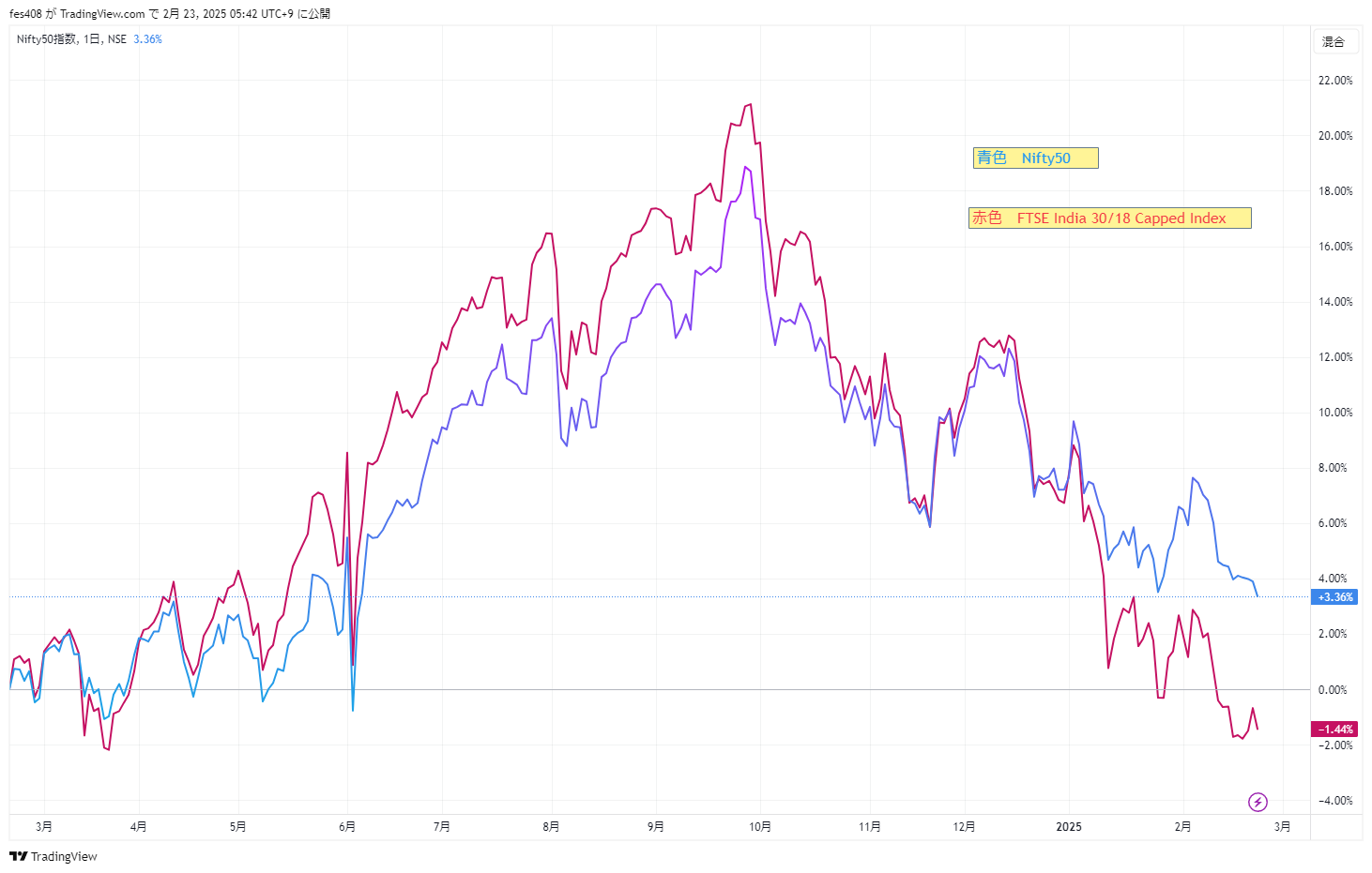 なお、Nifty50とFTSE India 30/18 Capped Indexを比較するとFTSE India 30/18 Capped Indexのほうがここ1年の上昇及び下落が大きくなっており、FTSE India 30/18 Capped Indexのほうがリスクが高いと考えられます。ただし、インド株式という面で比較すると、どちらも2024年の9月を高値として下落しているため、連動性は高いと思われます。