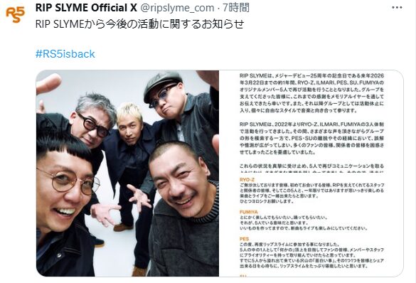 2025年4月4日、hip hopシーンに激震が走りました。約8年ぶりにRIP SLYMEがオリジナルメンバー5人(RYO-Z、ILMARI、FUMIYA、PES、SU)での活動再開を正式に発表したのです。