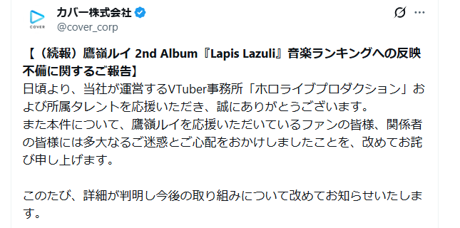 ファンからの指摘や問い合わせが殺到する中、2025年12月11日、ホロライブプロダクションを運営するカバー株式会社が公式X(旧Twitter)にて不備を報告しました。